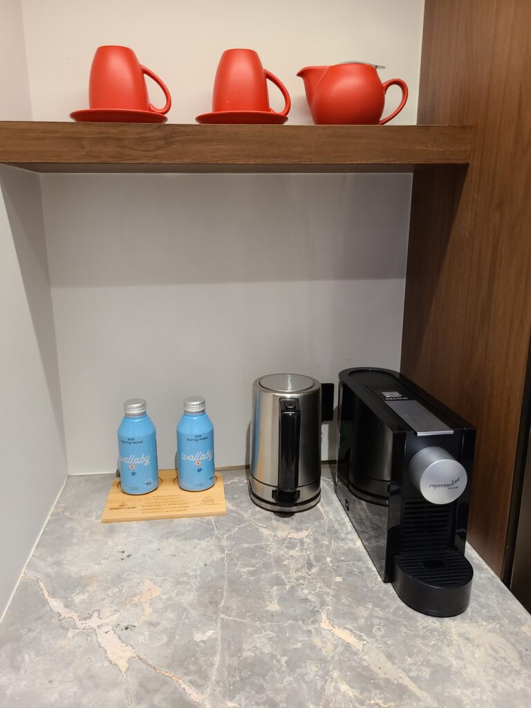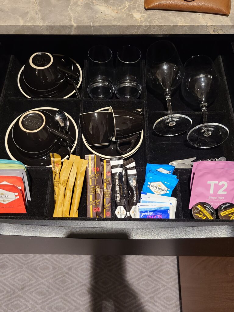 でもこの水のボトルが可愛かったです😊コーヒー、紅茶は引き出しの中に入ってました。