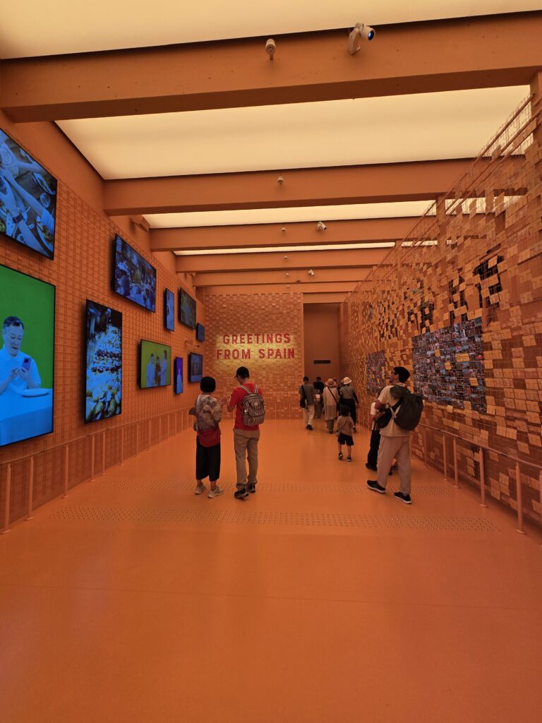 スペイン館はパビリオンの右側にあるレストランの左側の通路をまっすぐ進むとエレベーターのレーンがあり、ほぼ並ばずに入ることができました。エレベーターで入れるのでベビーカーのまま入ることができました。