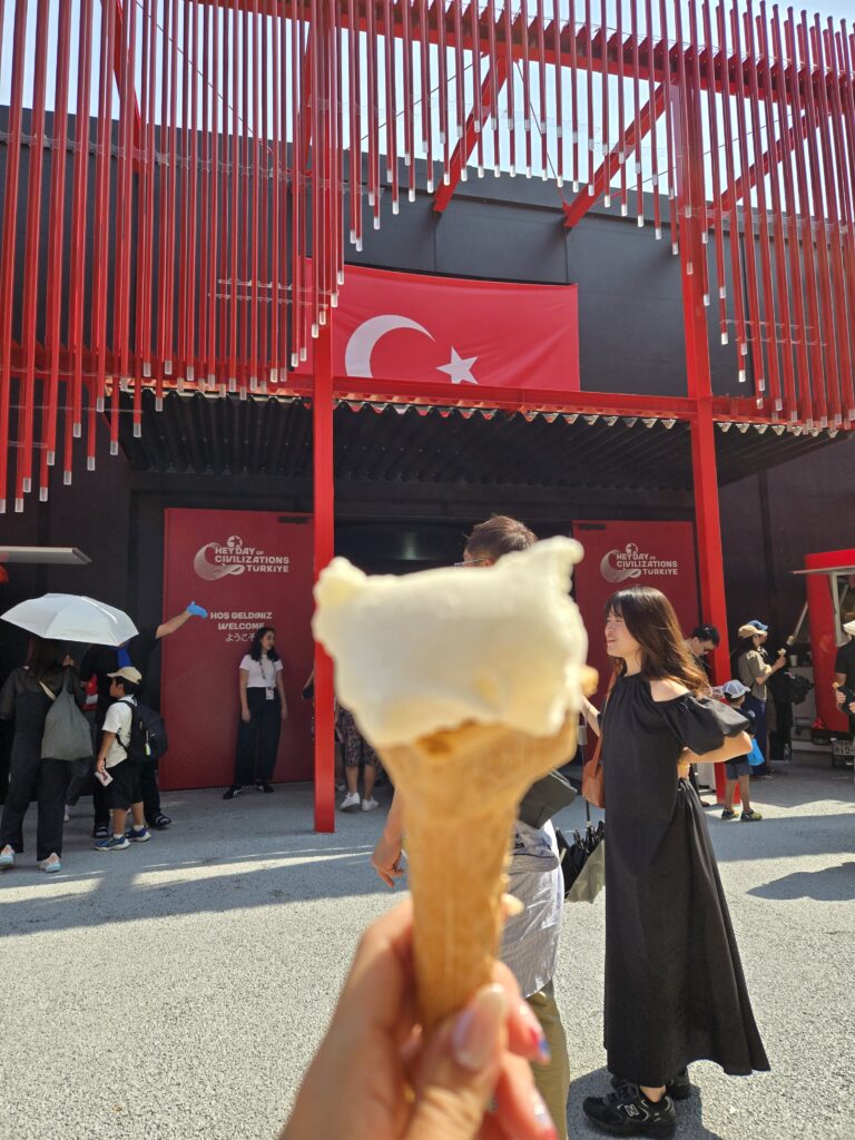 昔コンビニに売っていたトルコアイスが大好きだったのですが、本場のトルコアイスはさらにもちもちで美味しかったです!800円と万博価格ではありましたが、絶対食べてみるべきです!