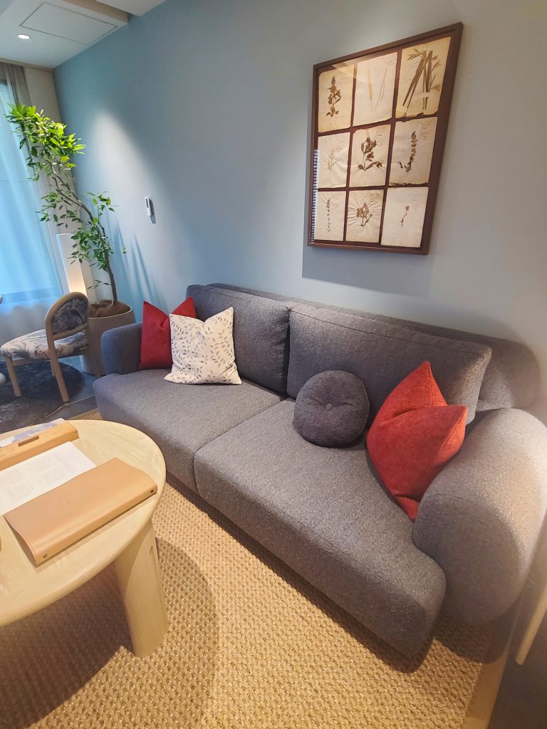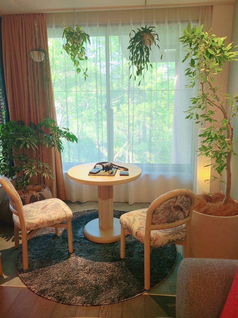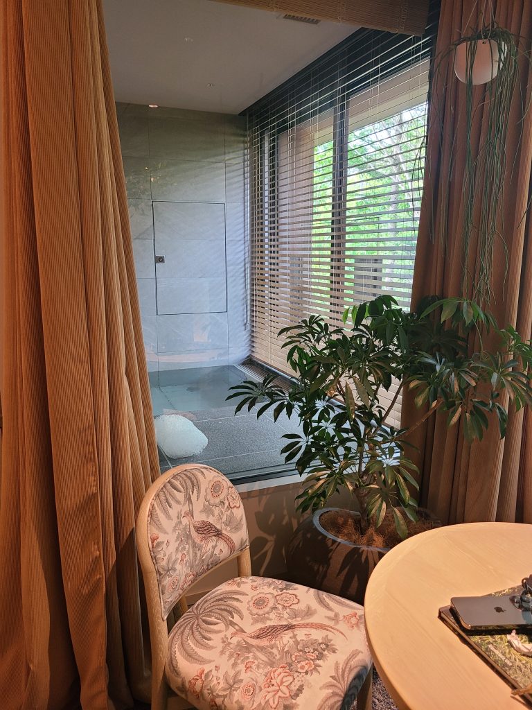 窓際のデスクとチェアのところが緑が綺麗で素敵でした!ここはカーテンで仕切れるので、子供が寝た後もここでのんびりできるので良かったです。強いて言えば、ソファとベッドの間にカーテンがあると良かったかも。お風呂はここからは丸見えです。笑