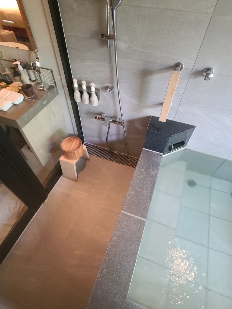 洗い場が狭いという口コミも見たのですが、1歳の子と入るにはあまり気にならなかったです。洗い場の広さは家庭用のお風呂の3分の2くらいでした。夕方や夜も良いのですが、なんと言っても朝が最高でした!朝日が差し込んで外の緑も綺麗でいつも長風呂しない私ですが、お茶を飲みながらのんびり入りました。(夫と子供はまだ寝てた)