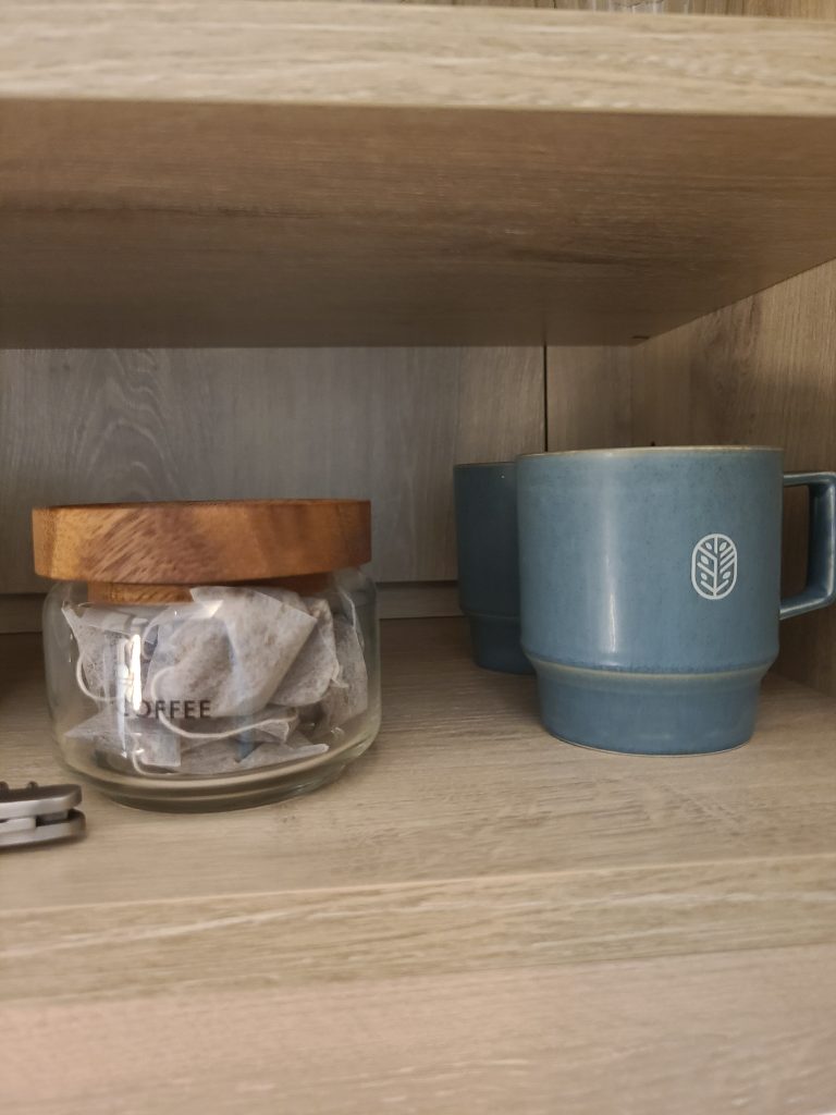 棚の中にはグラスとティーカップ、コーヒー、ハーブティーが入っていました。コーヒーは珍しいティーパックタイプでした。電気ケトルが温度調節できるタイプですごく使いやすかったです。