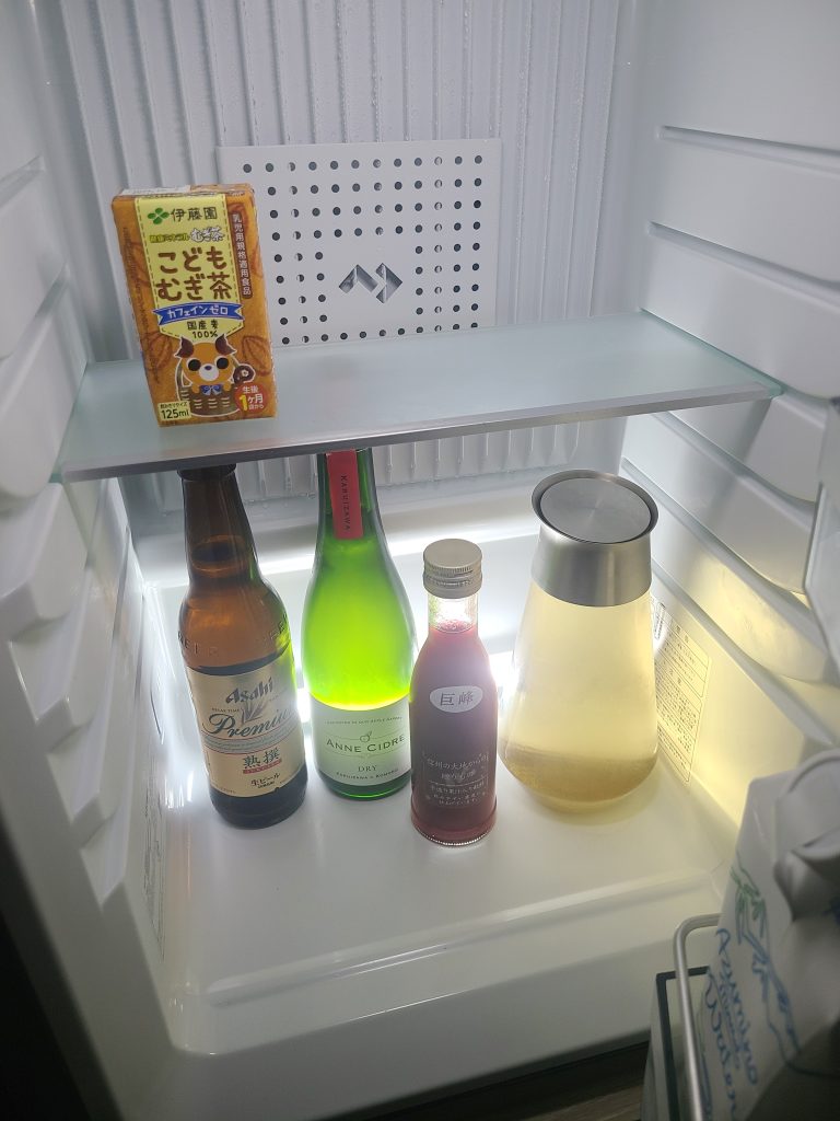 冷蔵庫の中のお酒は無料ですが、棚の上にあるお酒は有料なので要注意です。