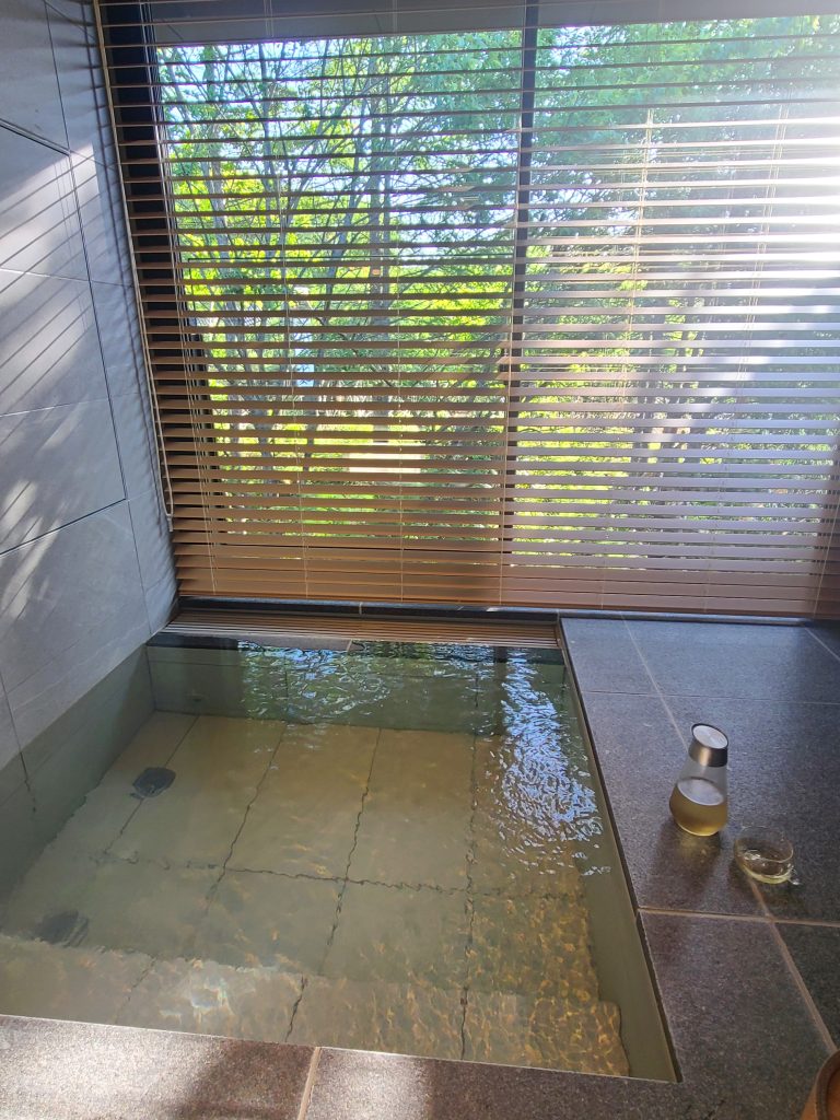 ふふ軽井沢陽光の風は全客室に広々とした天然温泉のお風呂がついています。残念ながら露天風呂ではないのですが、窓が大きく光が差し込むので露天風呂のような気分で入ることができました!