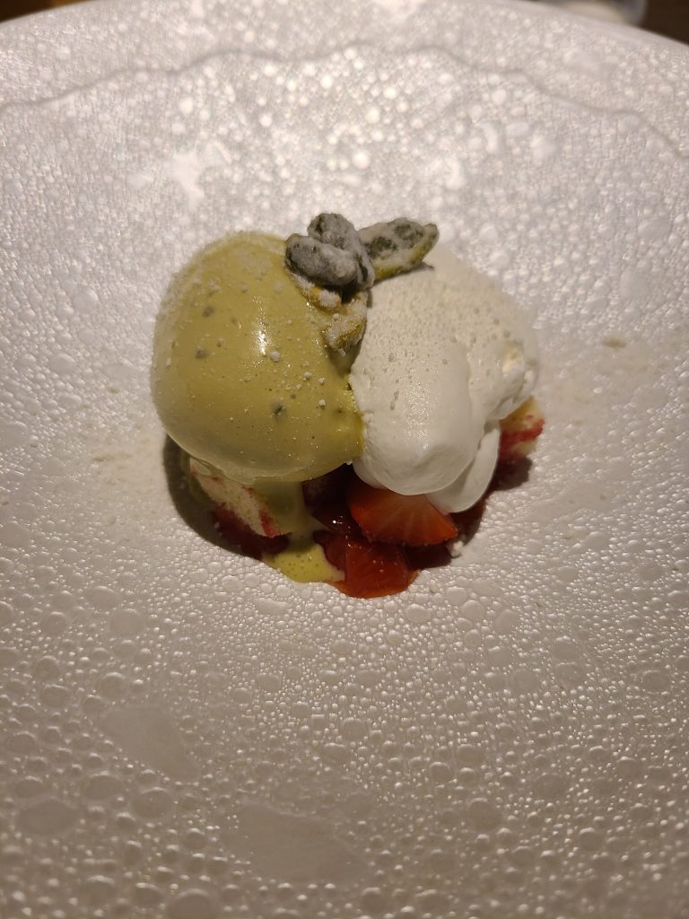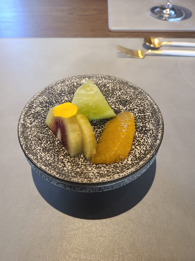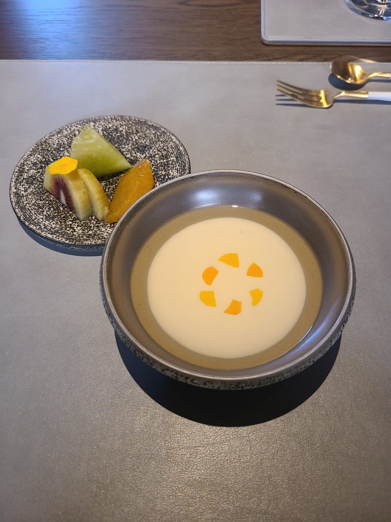 デザートにフルーツが出てきたのですが、なんとフルーツのお皿は蓋になっていて、下にはヨーグルトのブラマンジェが入っていました!