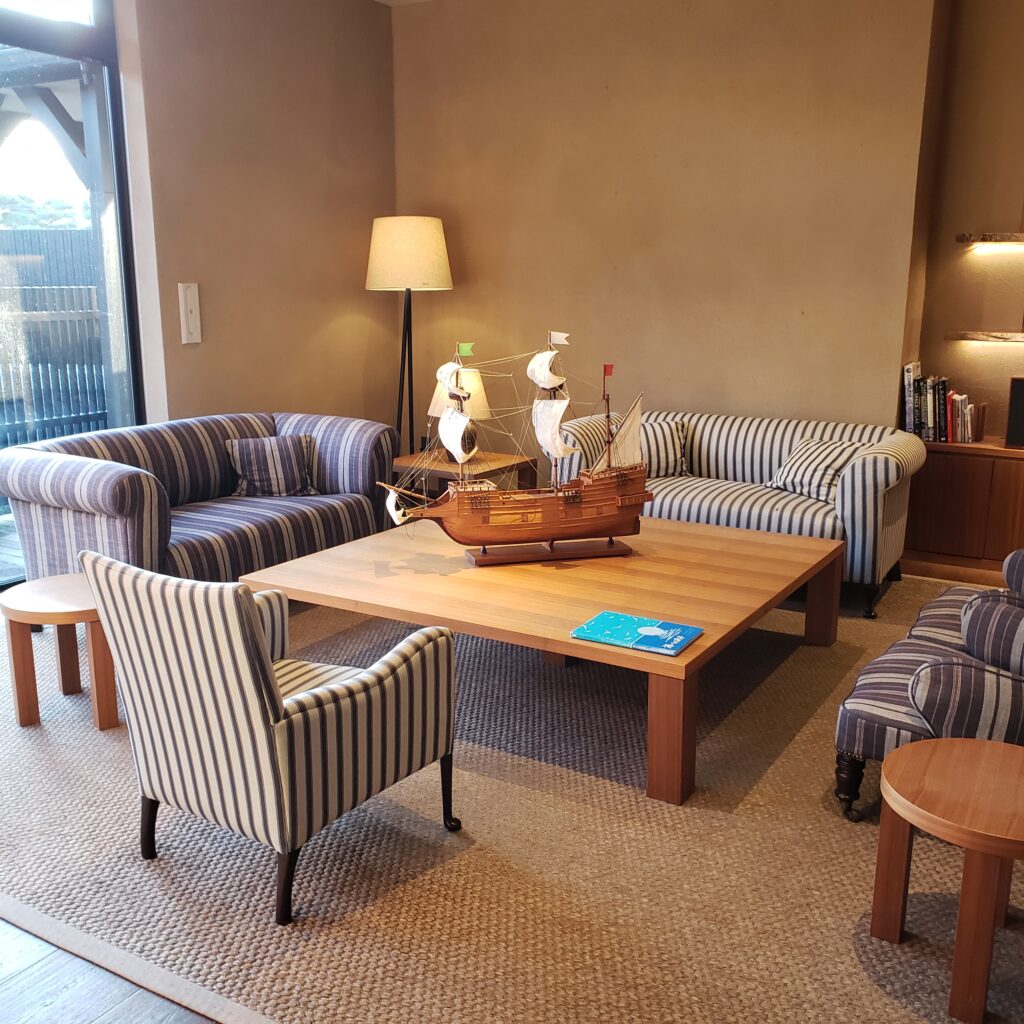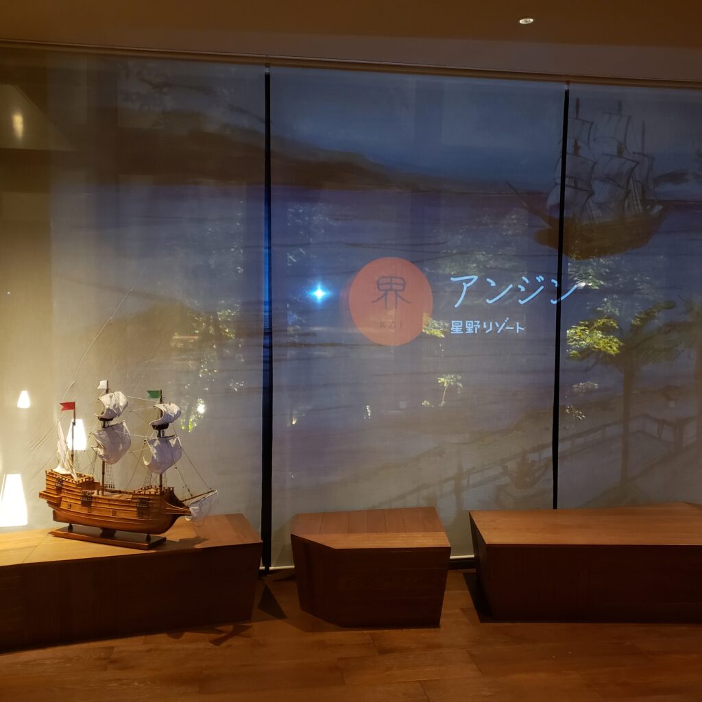 星野リゾート界アンジンは海や船旅をイメージしたインテリアで、ロビーも船の中のような雰囲気でした!