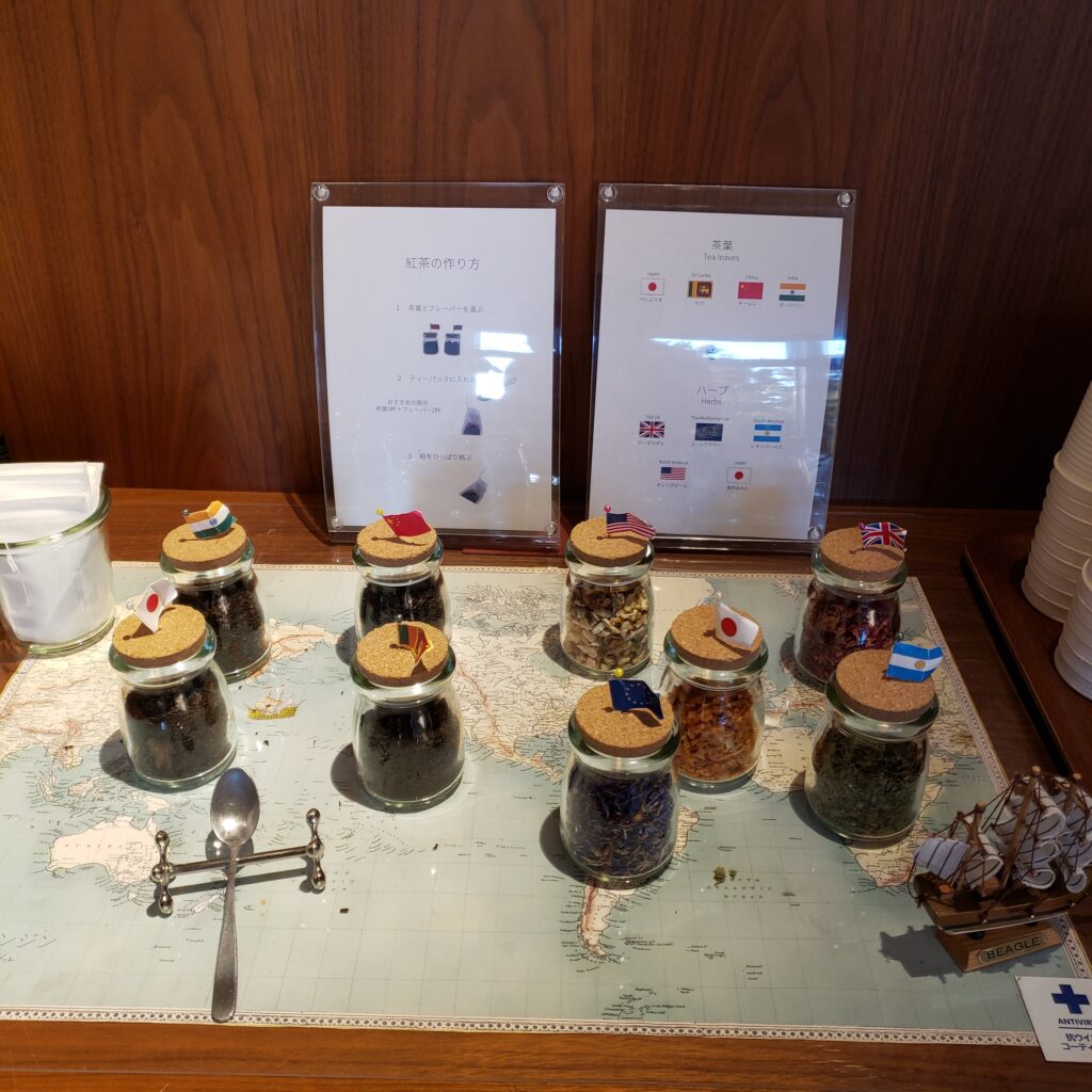ロビーではフリードリンクで様々な国のお茶が楽しめるようになっていました。