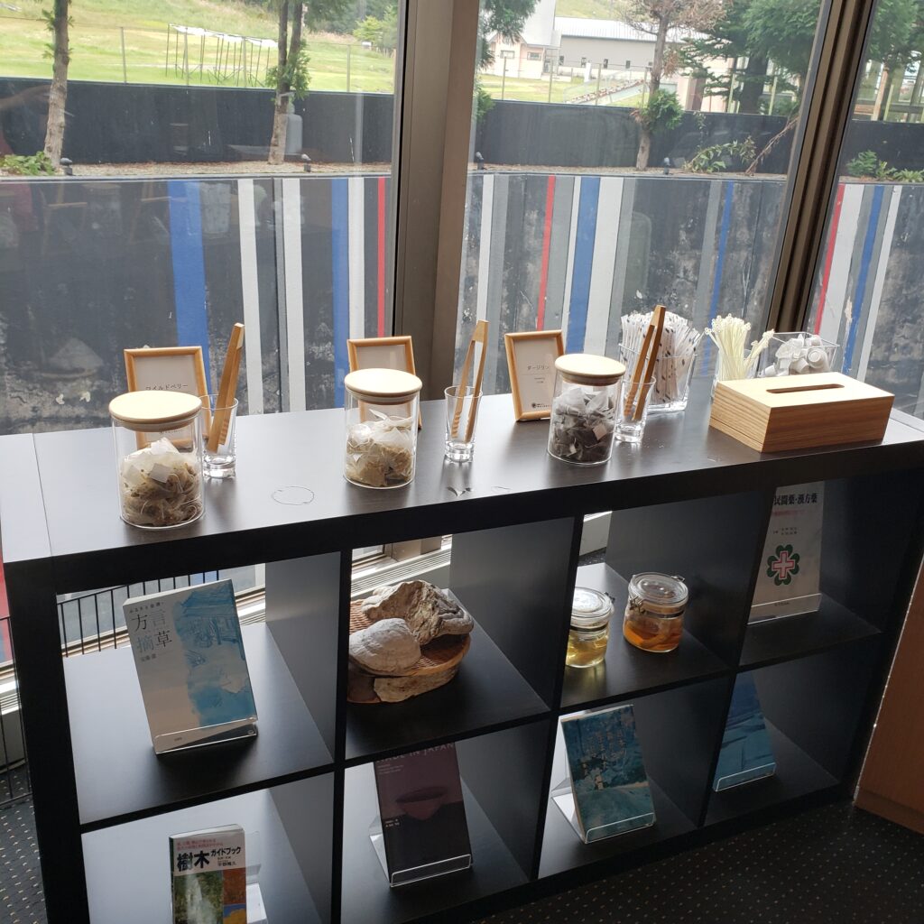ロビーではフリードリンクでハーブティーがいただけます。本もたくさん置いてあってブックカフェのような雰囲気です。ルームキーにも赤べこがついていて可愛かったです。