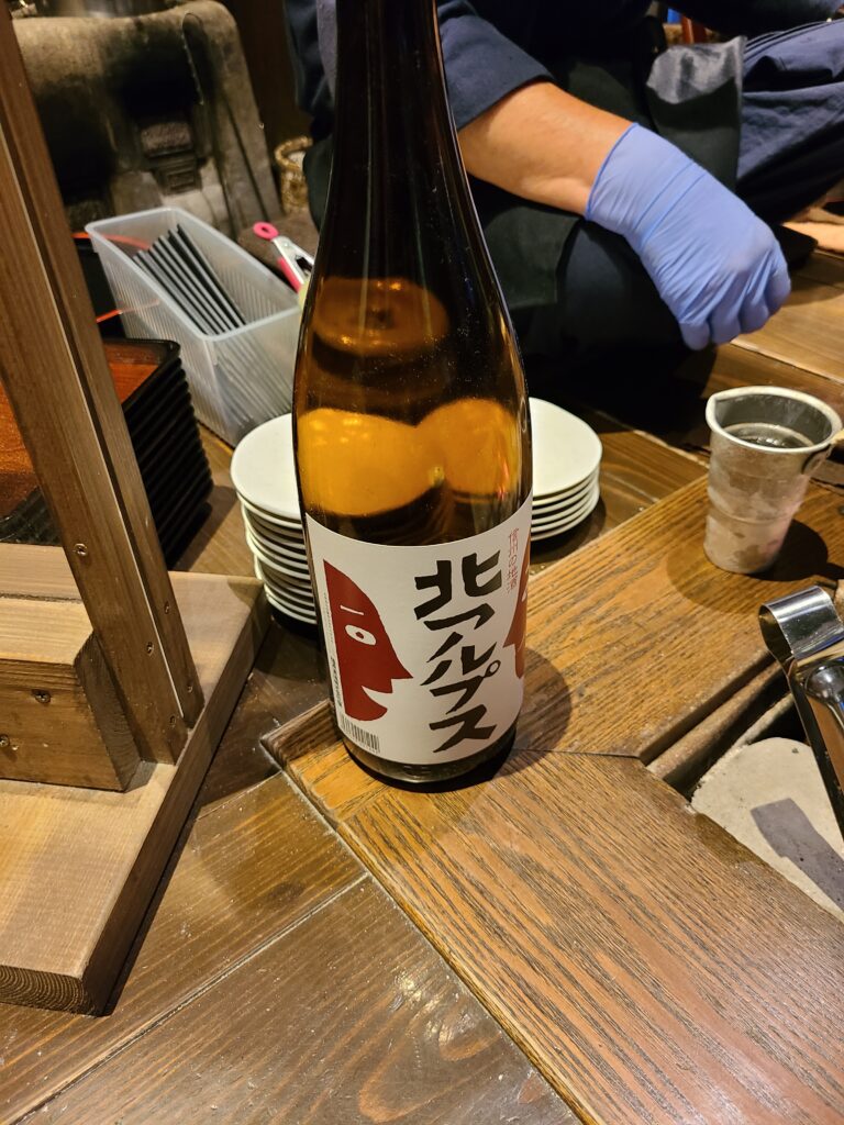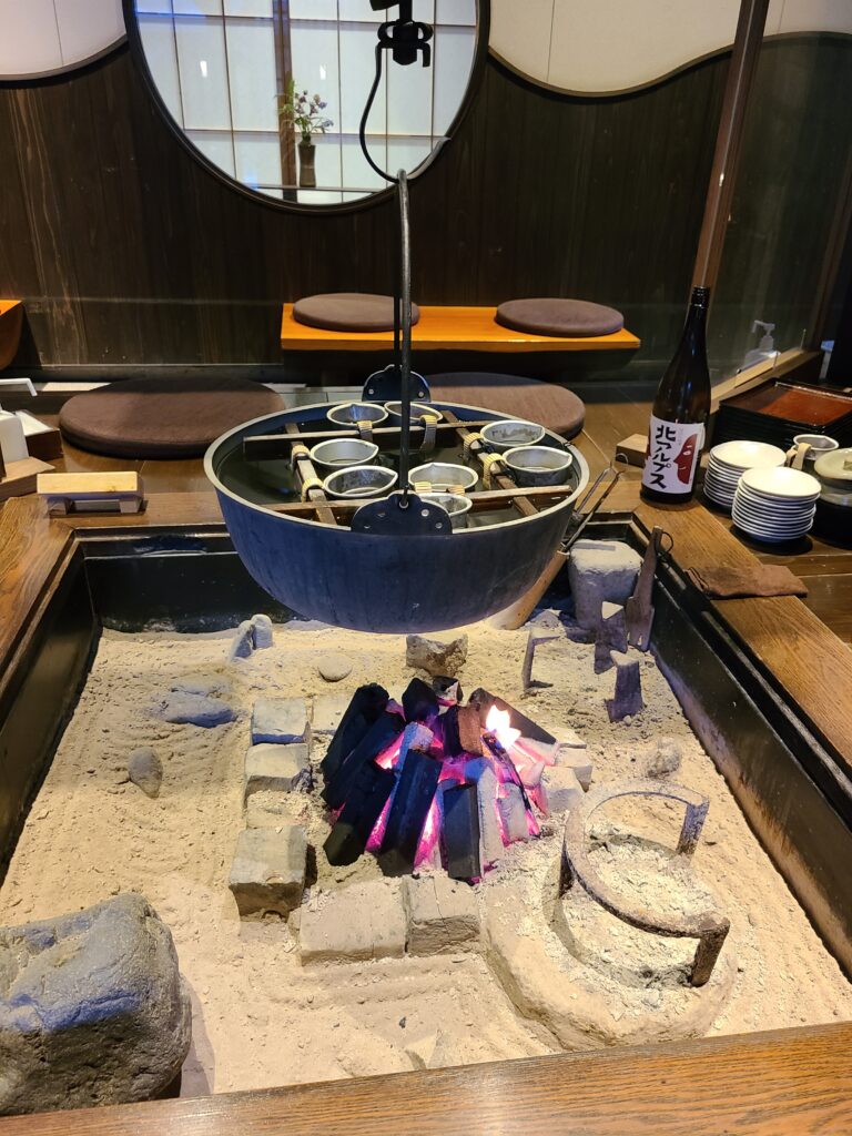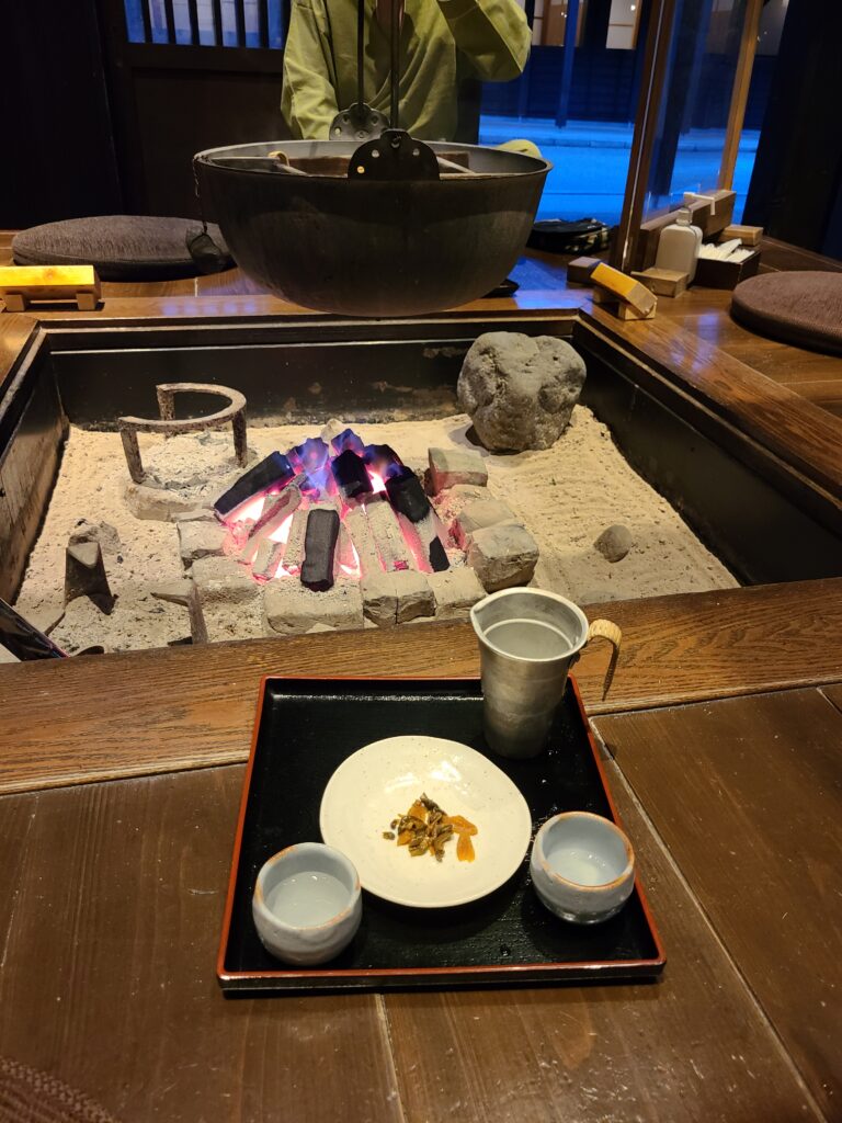 界アルプスには囲炉裏のスペースがあり、7:00PM~9:15PMの間はなんと無料でアルプスの美味しい日本酒を熱燗でいただけます!しかもおちょこではなく、結構大きめのカップにたくさん淹れてくれます。