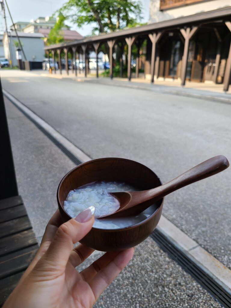 朝6:30amから囲炉裏スペースで無料で食べられる「おめざがゆ」!