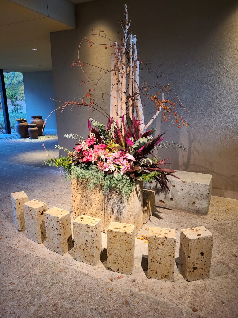 素敵な装花や壺が置いてあります。こちらの壺は置いてある柄杓で水を汲むと綺麗な音がなるので是非やってみてくださいね。