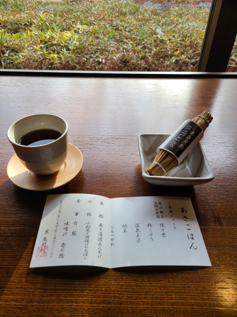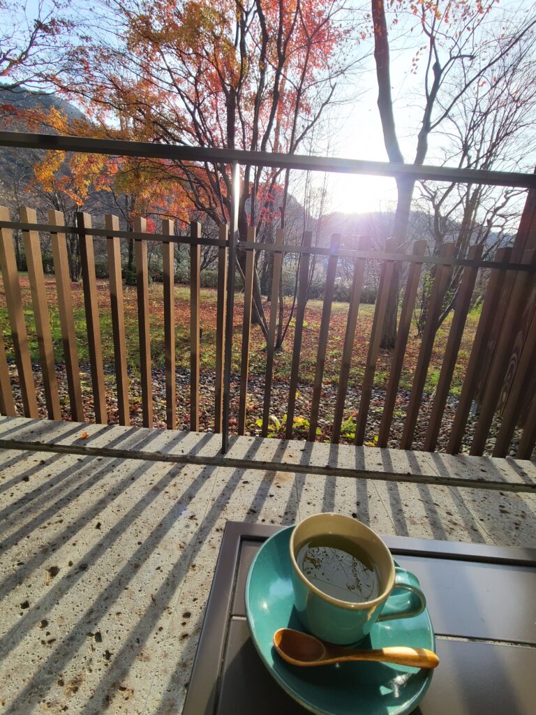 紅葉が見られる素敵なテラスがあるので、朝日を浴びながら益子焼のカップでコーヒーを飲みました。