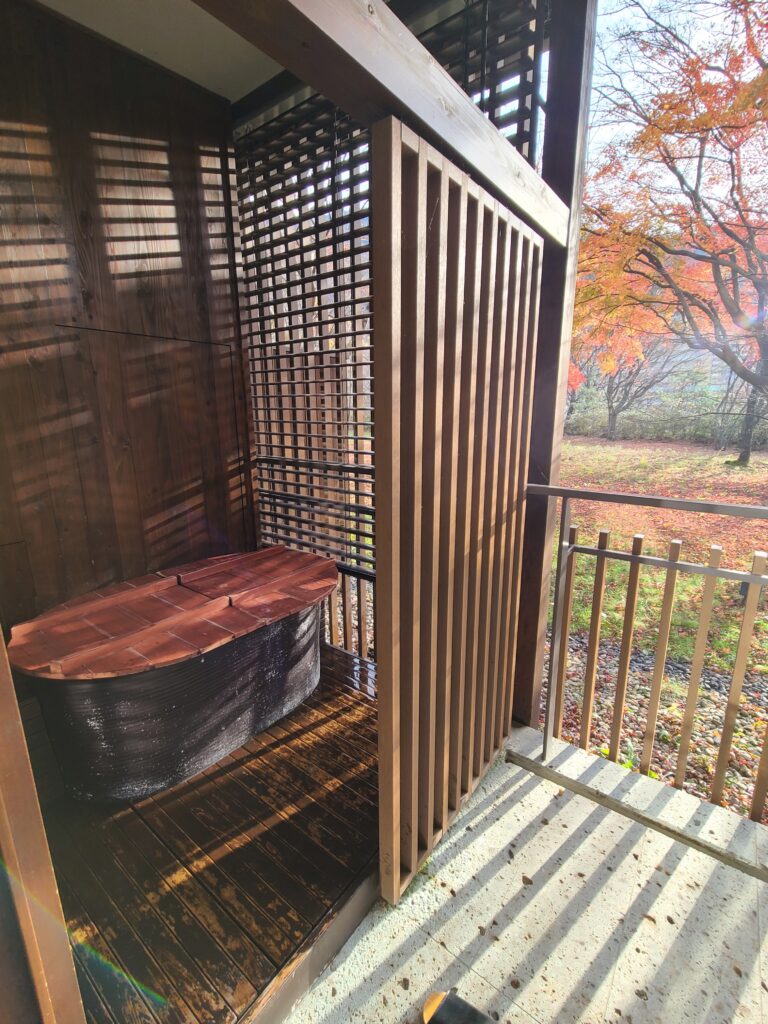シャワーブースの奥に露天風呂があり、シャワーをしてそのまま露天風呂に入ることができます!
