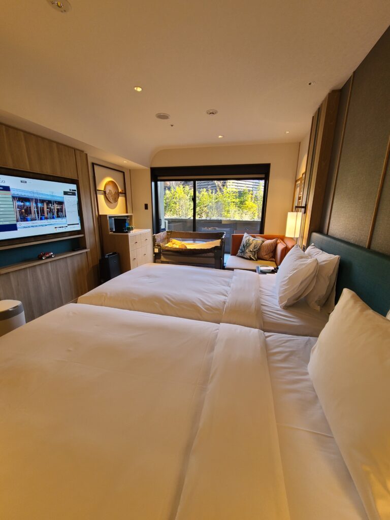 お部屋はベビーベッドを置くと少し狭いかな?といった感じですが、新しいホテルなので清潔感があってとっても良かったです。またテラスもあって明るい感じでした!