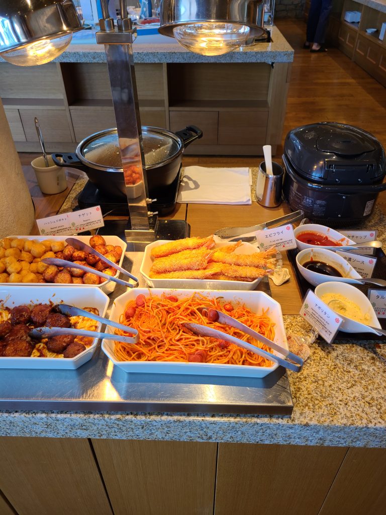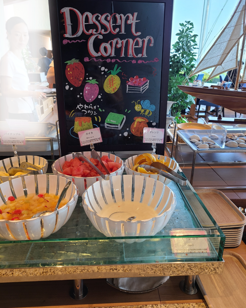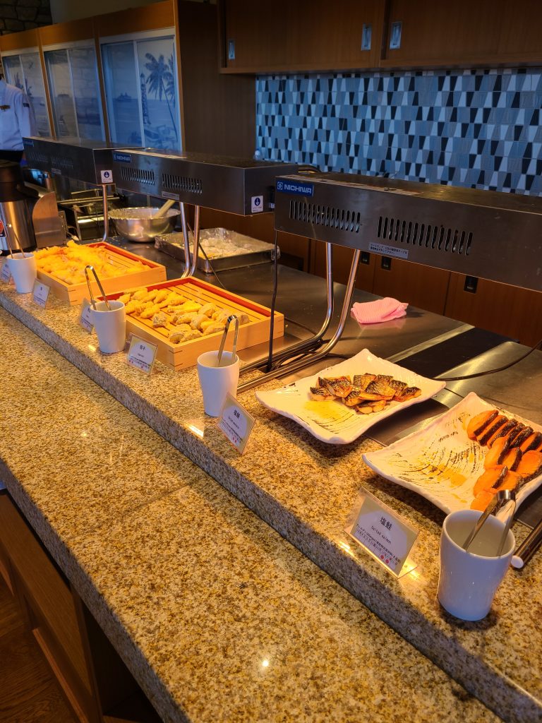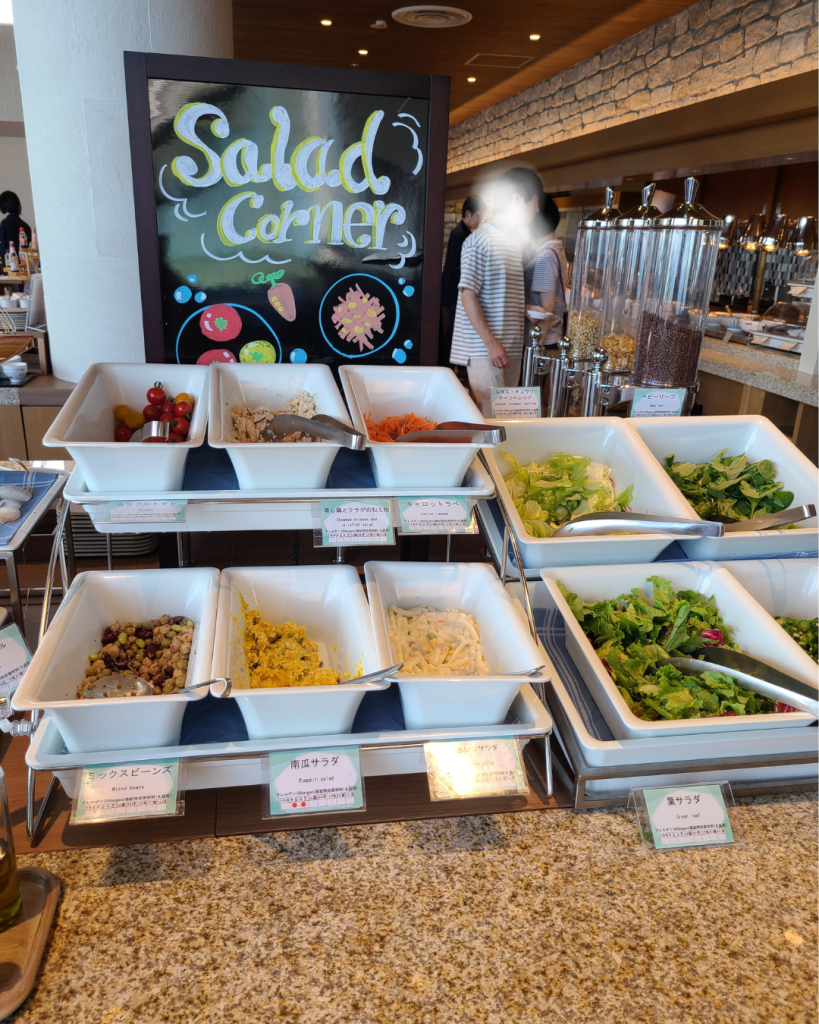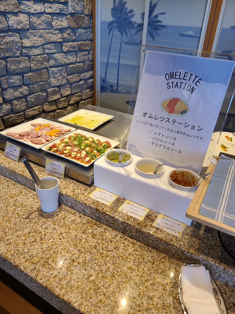 朝ご飯は朝食ビュッフェでした!サラダもハムもデザートも充実していて、自分で作れる海鮮丼コーナーもありました!あったかいできたてのオムレツを作ってもらえるコーナーもありました!