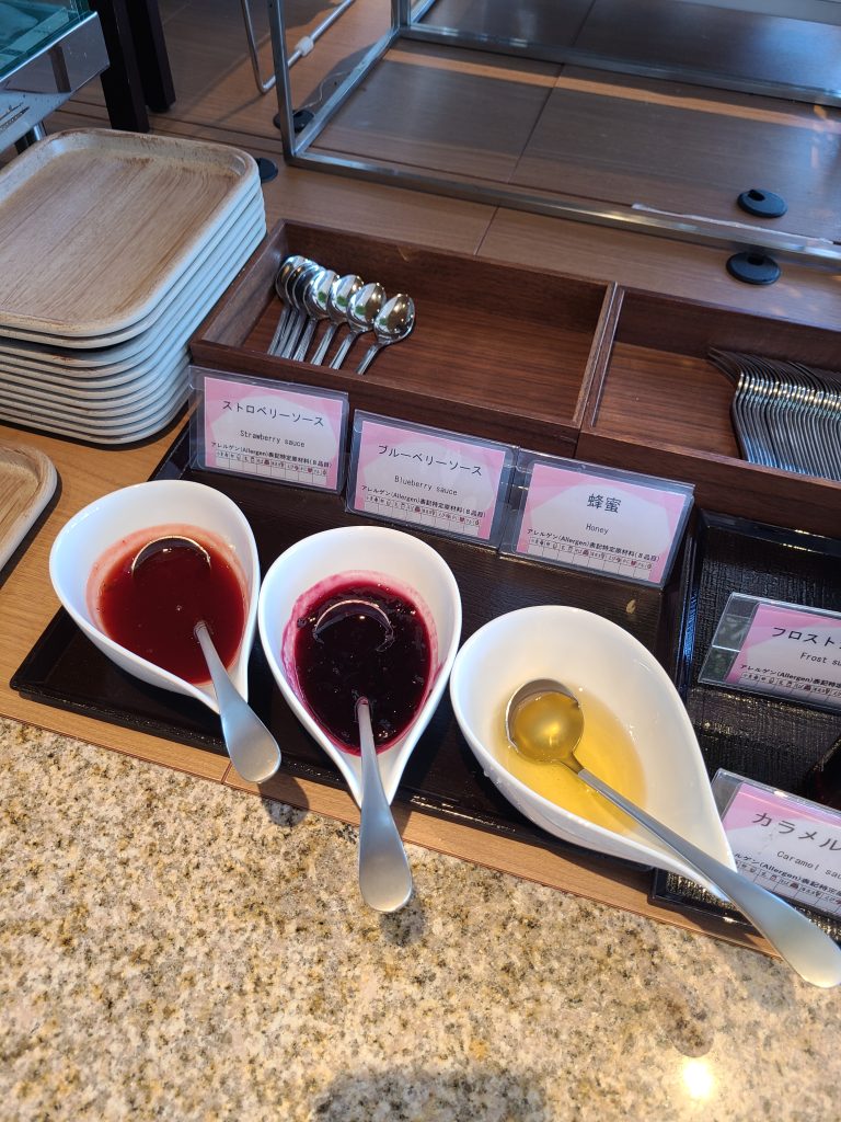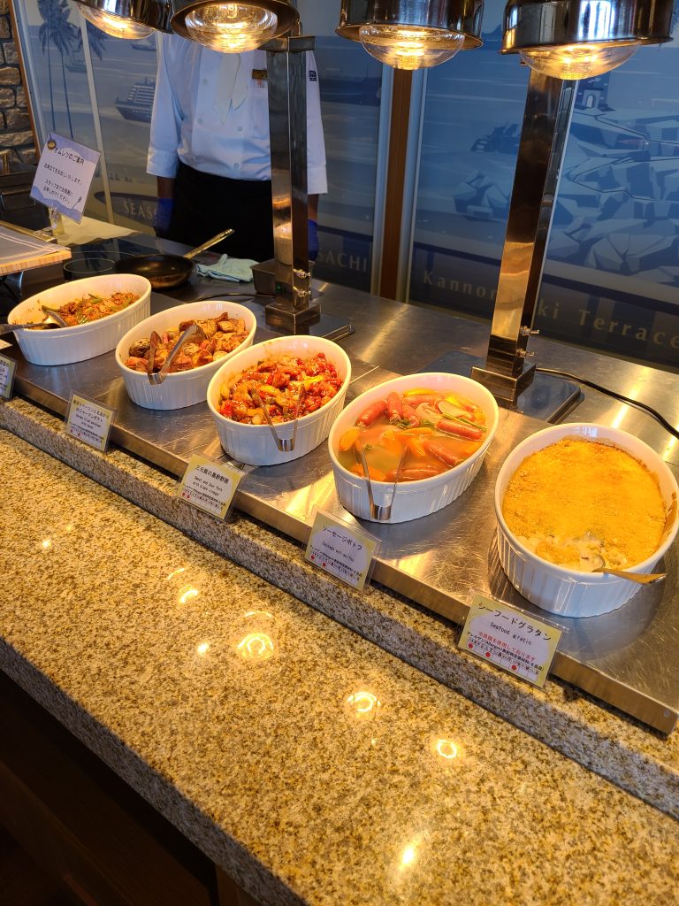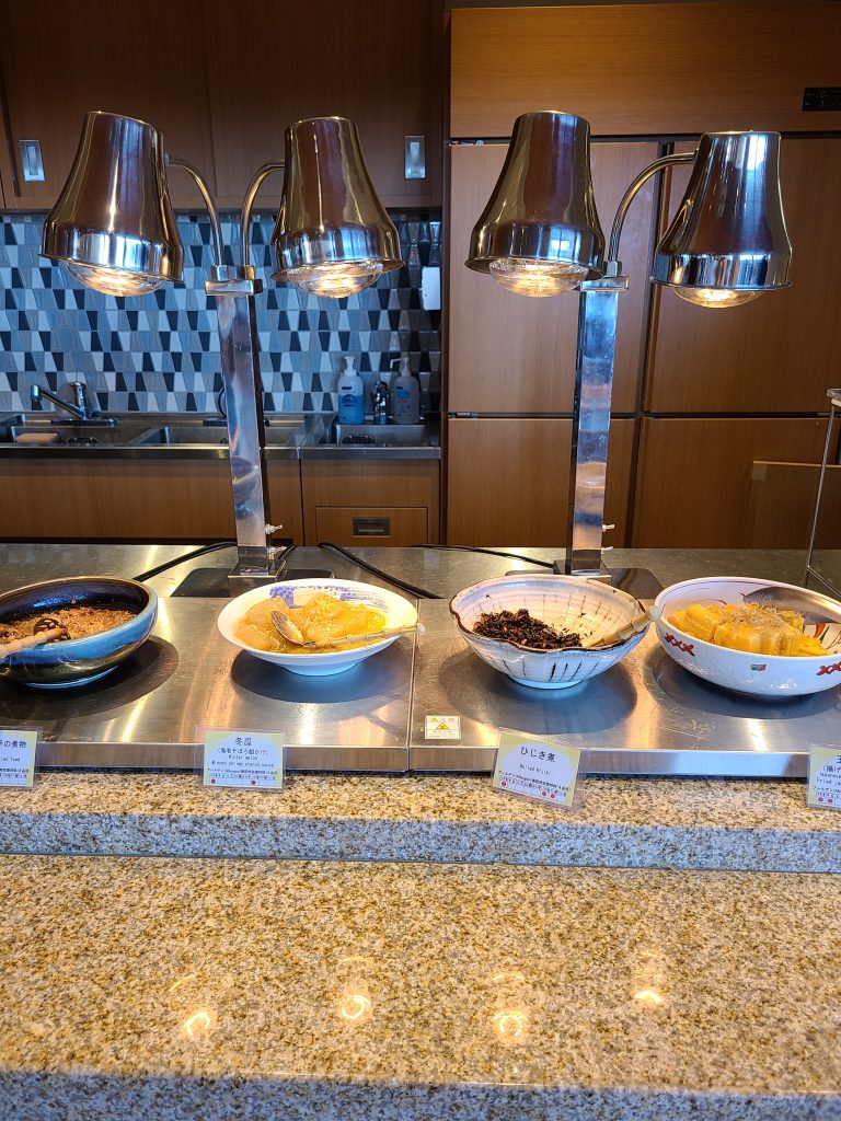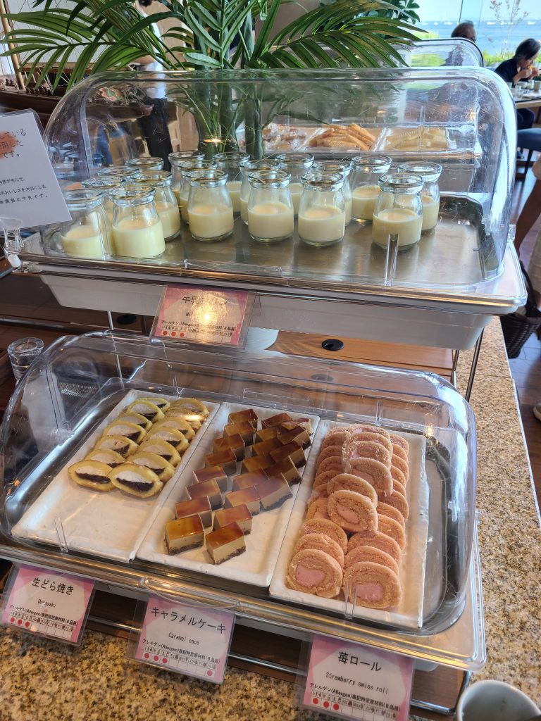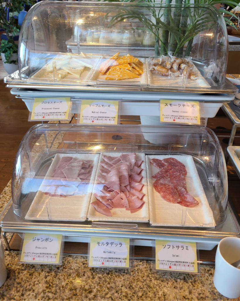 朝ご飯は朝食ビュッフェでした!サラダもハムもデザートも充実していて、自分で作れる海鮮丼コーナーもありました!あったかいできたてのオムレツを作ってもらえるコーナーもありました!