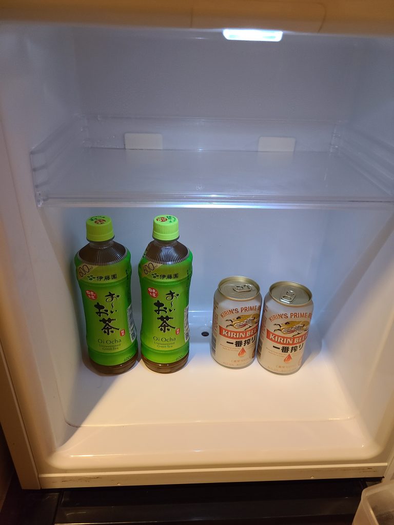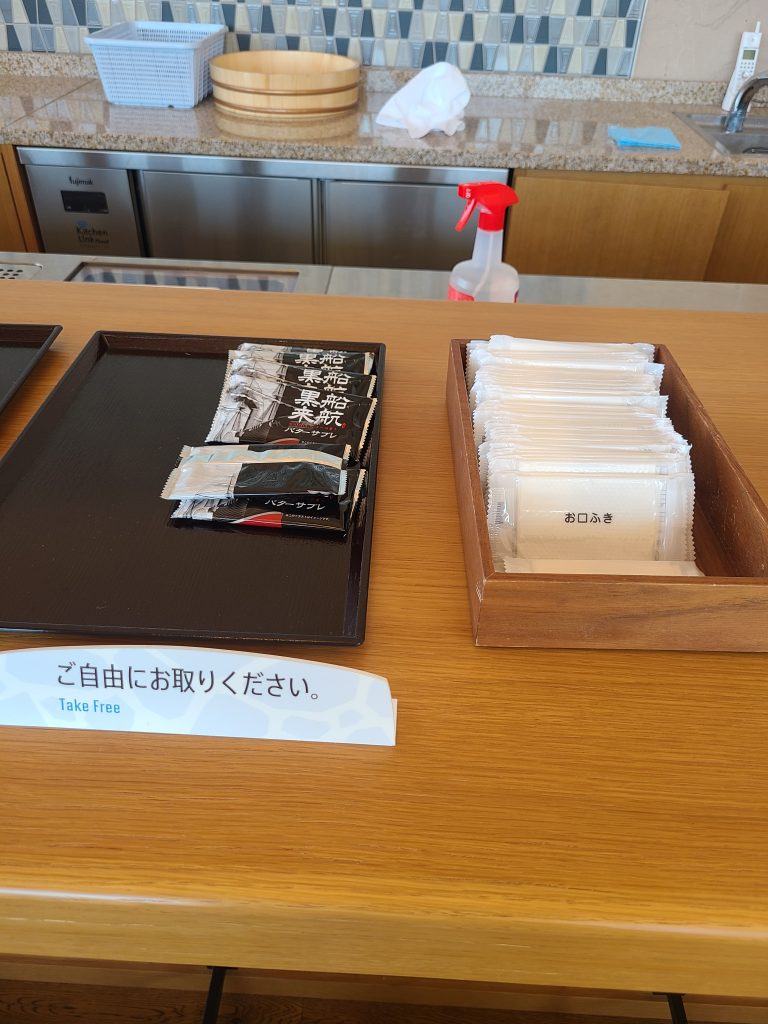ウエルカムスイーツは横須賀カレーせんべいでした。冷蔵庫の中のお茶とビールも無料でした!