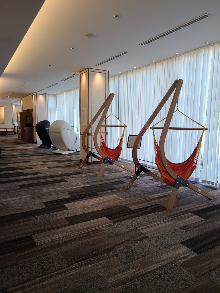 お風呂の外にはハンモックとマッサージチェアがあり、マッサージチェアも無料でした!