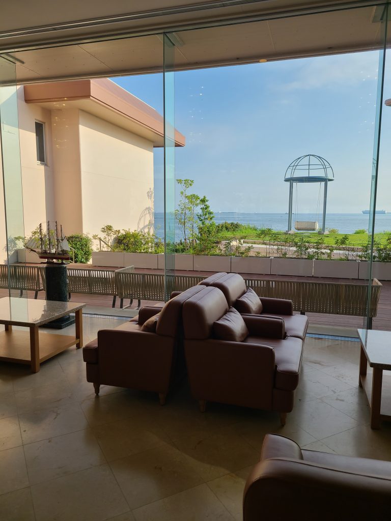 15時過ぎについたのでチェックインが少し混んでいたのですが、海が見えるオーシャンビューのラウンジでコーヒー、ジュース、スープが自由に飲み放題でした!