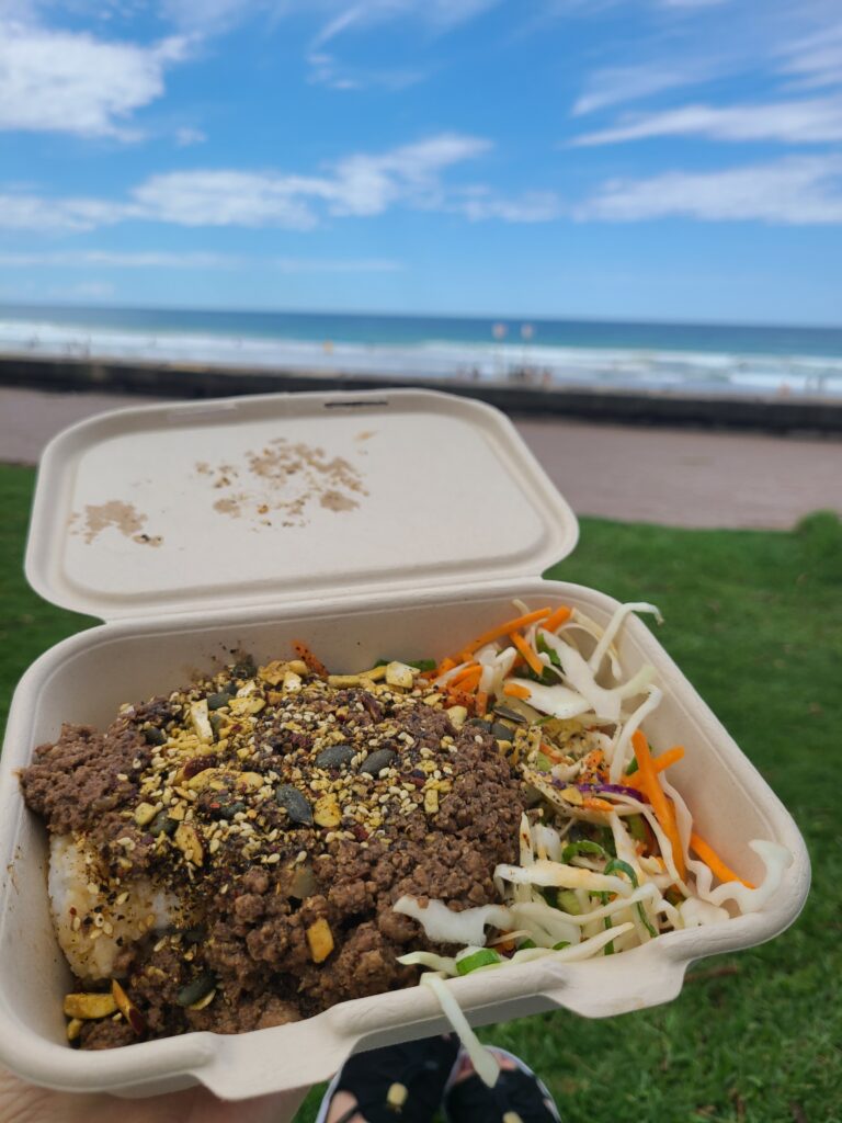 お昼ご飯はテイクアウトしてビーチの目の前の芝生で食べました!