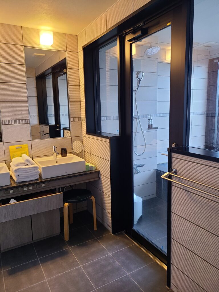 半露天温泉ってどういうことだろう?と思ったのですが、屋根はあって大きな窓で外とつながっているタイプのお風呂でした!夜は虫が入ってきそうなので網戸をしていましたが、昼間は網戸を開けて入ると開放的で良いですね!